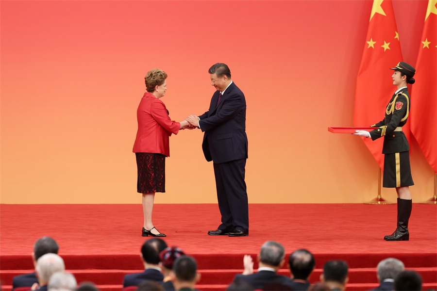 President Xi awards Dilma Rousseff, former Brazilian president and president of the New Development Bank, with the Friendship Medal. The medal is the highest honor that China awards to foreign friends. (WANG ZHUANGFEI/CHINA DAILY)