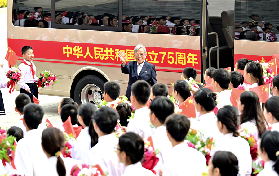 Members of the Chinese Young Pioneers salute the recipients of national medals and national honorary titles at the award ceremony on Sunday. (Photo/Xinhua)