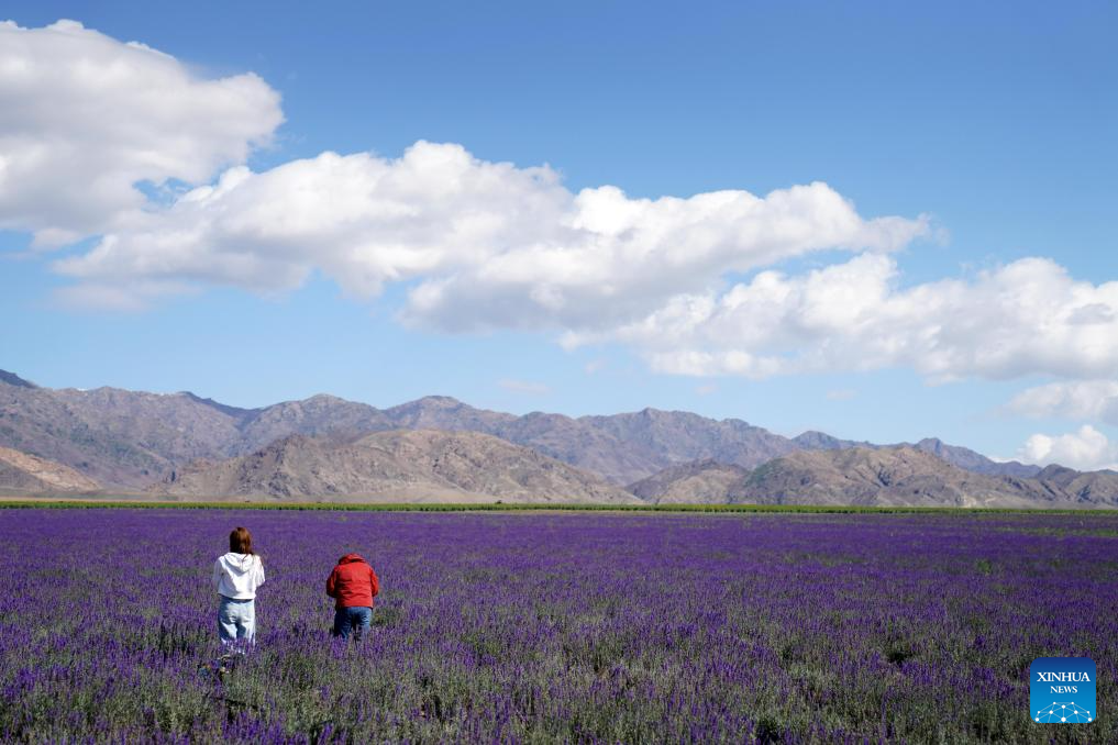 Visitors have fun at a lavender flower field at Tianshan Huahai national modern agricultural industrial park in Yining City, Ili Kazak Autonomous Prefecture, northwest China's Xinjiang Uygur Autonomous Region, Sept. 28, 2024. With a construction area of 60,000 mu (about 4,000 hectares), the park aims to develop various industries such as agriculture and forestry, processing of agricultural products, and leisure tourism, in order to create a distinctive demonstration zone with integrating features. (Xinhua/Zhao Yusi)
