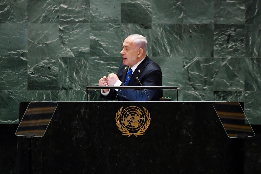Israeli Prime Minister Benjamin Netanyahu delivers a speech during the General Debate of the 79th session of the United Nations General Assembly (UNGA) at the UN headquarters in New York, on Sept. 27, 2024. (Xinhua/Li Rui)