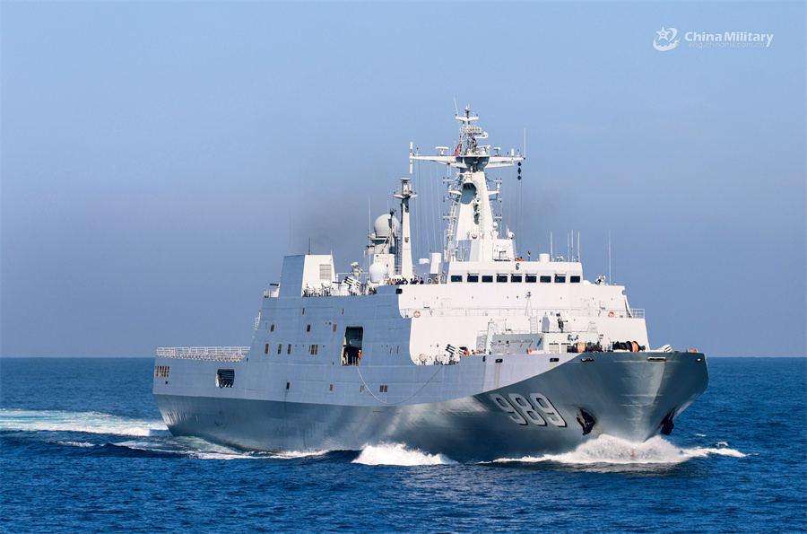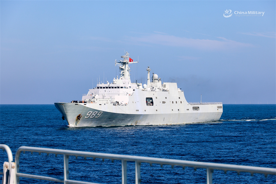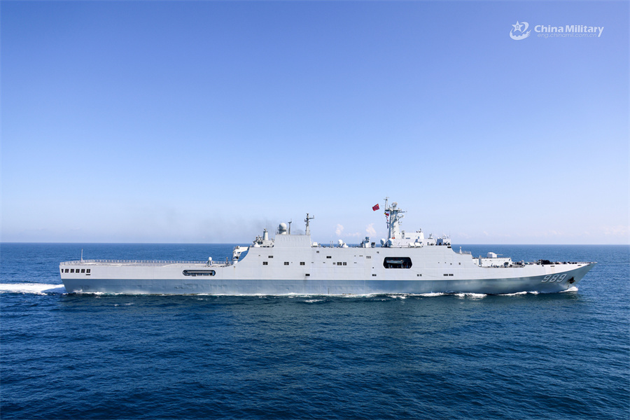 The amphibious dock landing ship Changbaishan (Hull 989) attached to a ship formation of a landing ship flotilla with the navy under the Chinese PLA Southern Theater Command sails on the sea during a maritime training exercise on August 4, 2024. (eng.chinamil.com.cn/Photo by Qiao Chenxi)