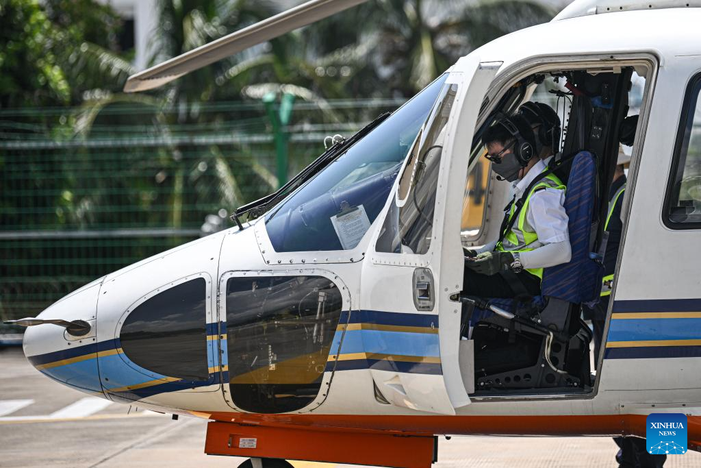 Staff members prepare for the inaugural flight of the first helicopter route from Sanya of south China's Hainan Province to Zhanjiang of south China's Guangdong Province, in Sanya, Sept. 29, 2024. The first helicopter route from Sanya to Zhanjiang successfully made its inaugural flight on Sunday. Operated by China Southern Airlines, the route is expected to have a flight duration of 60 minutes. (Xinhua/Pu Xiaoxu)