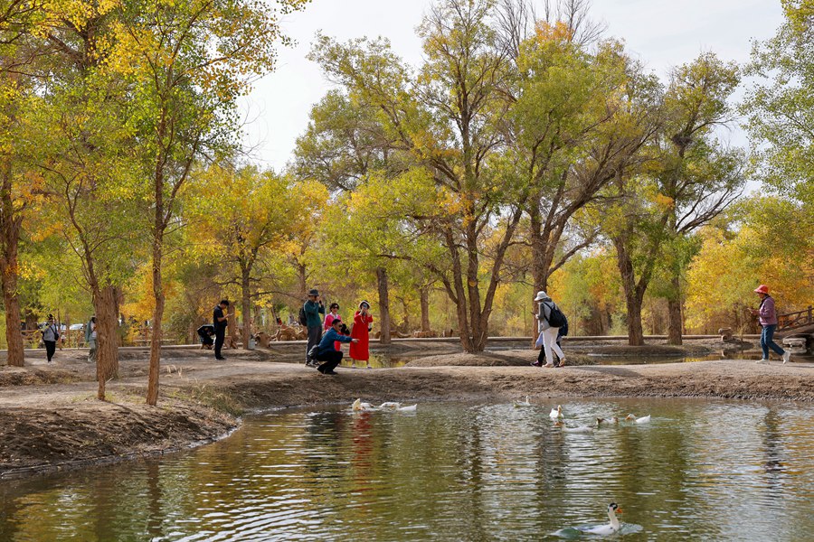 Visitors enjoy themselves at a vast desert poplar forest covering an area of more than 10,000 mu (about 666.67 hectares) in the Jinta desert poplar forest scenic area of Jiuquan city, northwest China's Gansu Province, Sept. 27, 2024. (Photo/Cao Hongzu).