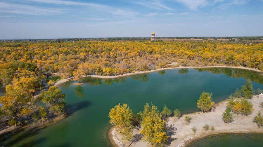 Photo taken on Sept. 27, 2024, shows a breathtaking autumn view of a vast desert poplar forest covering an area of more than 10,000 mu (about 666.67 hectares) in the Jinta desert poplar forest scenic area of Jiuquan city, northwest China's Gansu Province. (Photo/Cao Hongzu).
