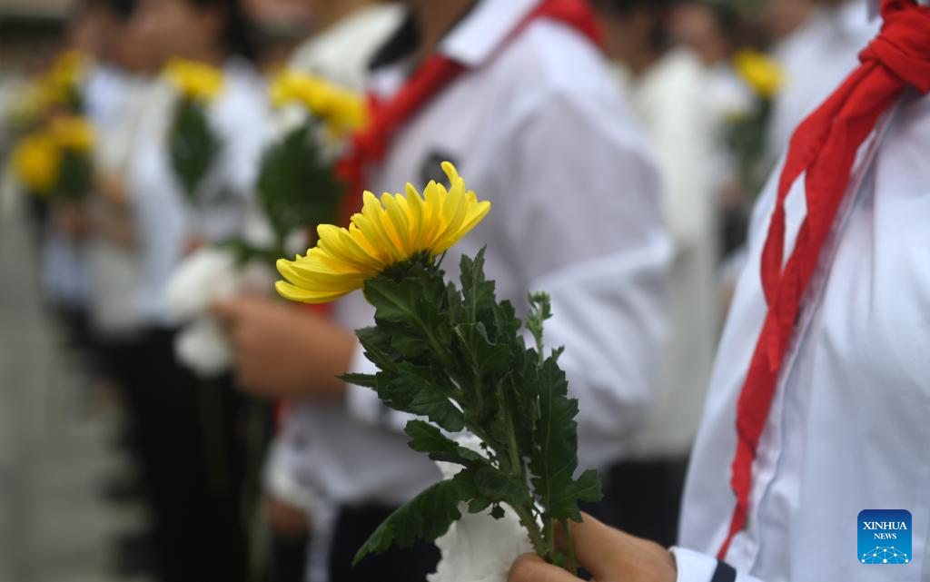 Members of the Chinese Young Pioneers sing during a mourning ritual at the People's Square in Urumqi, northwest China's Xinjiang Uygur Autonomous Region, Sept. 30, 2024. The event was held to mark China's 11th Martyrs' Day, a day ahead of its National Day. (Xinhua/Chen Shuo)