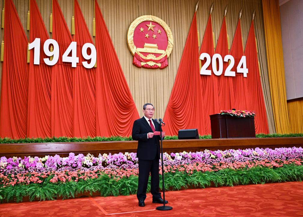 Chinese Premier Li Qiang, also a member of the Standing Committee of the Political Bureau of the Communist Party of China Central Committee, presides over a reception to celebrate the 75th anniversary of the founding of the People's Republic of China at the Great Hall of the People in Beijing, capital of China, Sept. 30, 2024. (Xinhua/Li Xueren)