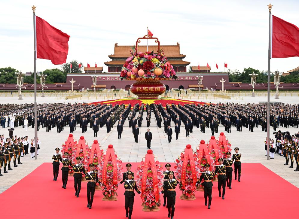 BEIJING, Sept. 30 (Xinhua) -- Chinese President Xi Jinping and other Party and state leaders on Monday attended a ceremony at Tian'anmen Square in central Beijing to present flower baskets to fallen heroes.