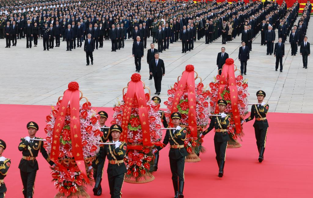 Chinese President Xi Jinping and other Party and state leaders including Li Qiang, Zhao Leji, Wang Huning, Cai Qi, Ding Xuexiang, Li Xi and Han Zheng attend a ceremony to present flower baskets to fallen heroes at Tian'anmen Square in Beijing, capital of China, Sept. 30, 2024. The event was held to mark Martyrs' Day, observed one day prior to National Day. (Xinhua/Yin Bogu)