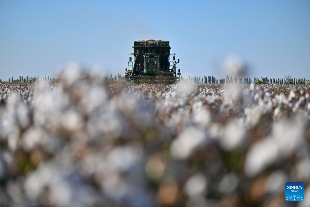 A cotton picker works in a cotton field in Wujiaqu City, northwest China's Xinjiang Uygur Autonomous Region, Sept. 29, 2024. The vast cotton fields of Xinjiang have entered the harvest season this year. (Xinhua/Hu Huhu)