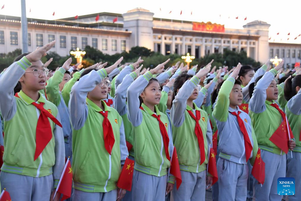 Members of the Chinese Young Pioneers attend a flag-raising ceremony marking the 75th anniversary of the founding of the People's Republic of China at the Tian'anmen Square in Beijing, capital of China, Oct. 1, 2024. (Xinhua/Ren Chao)