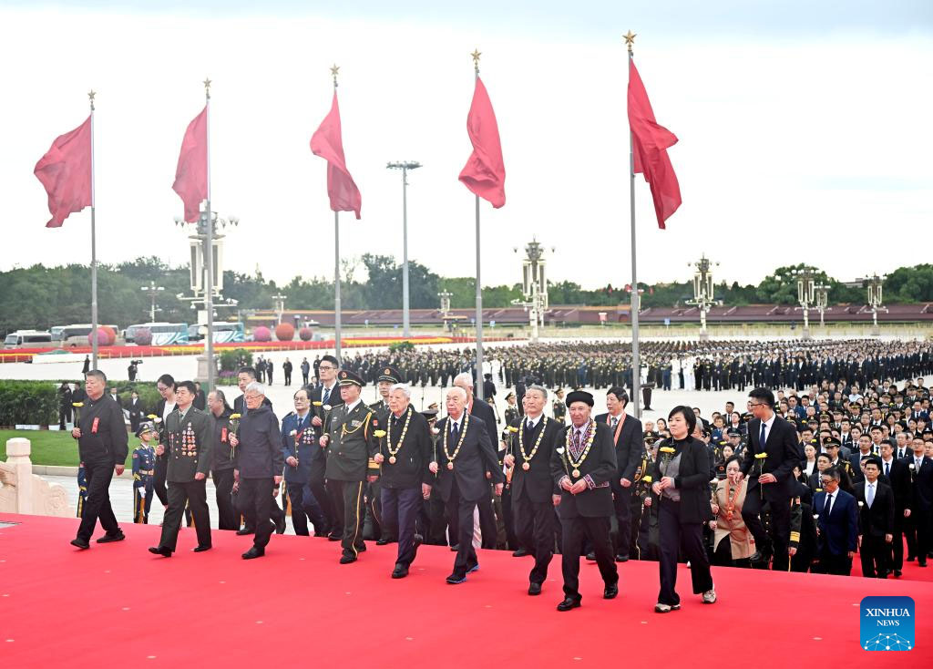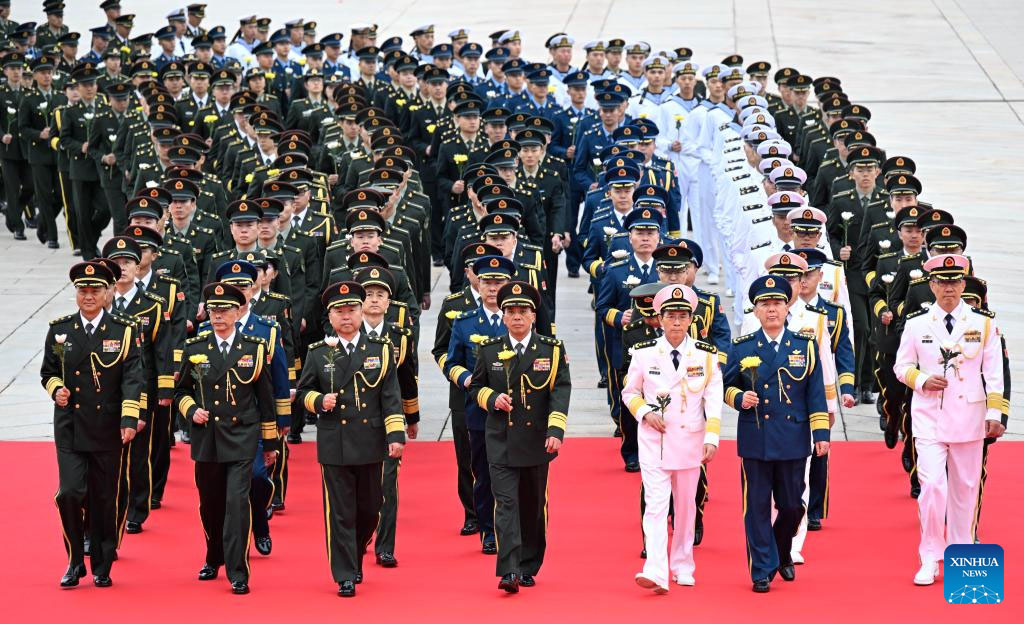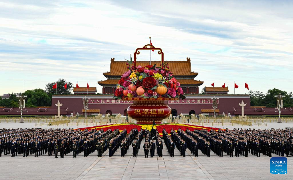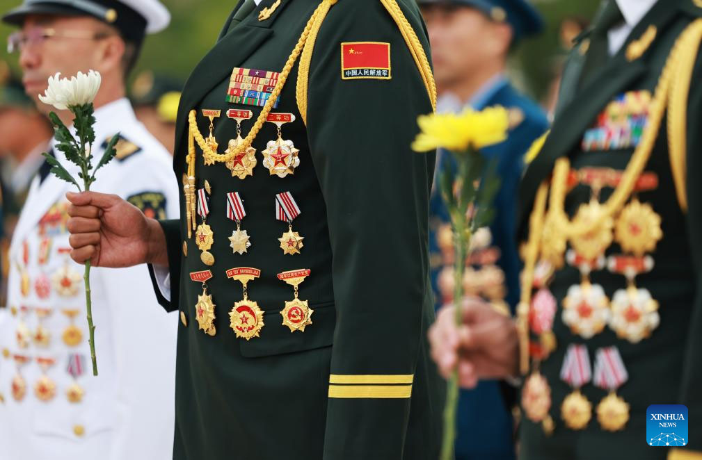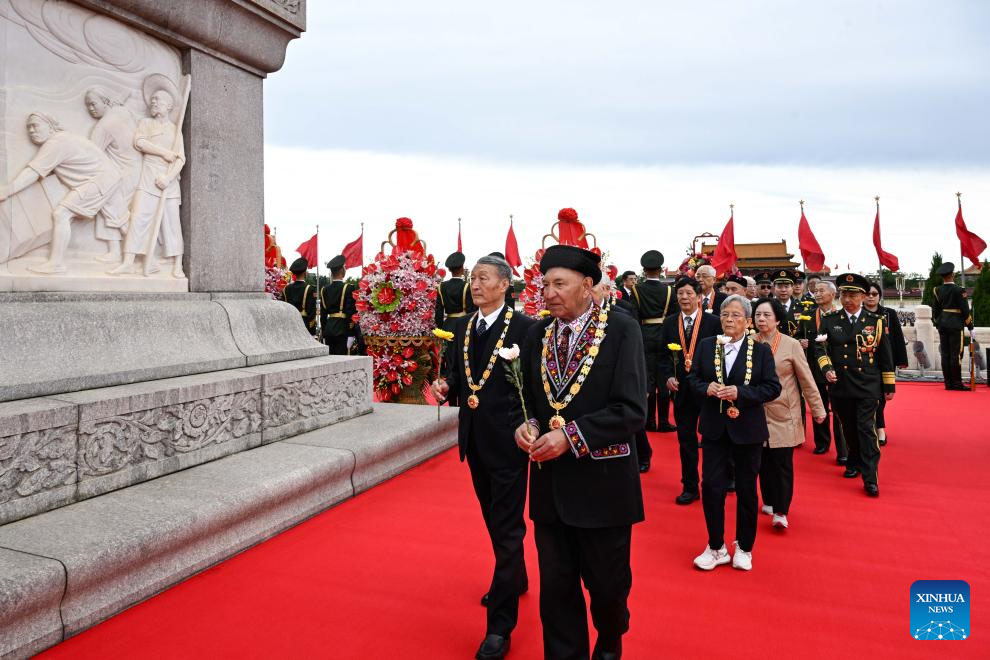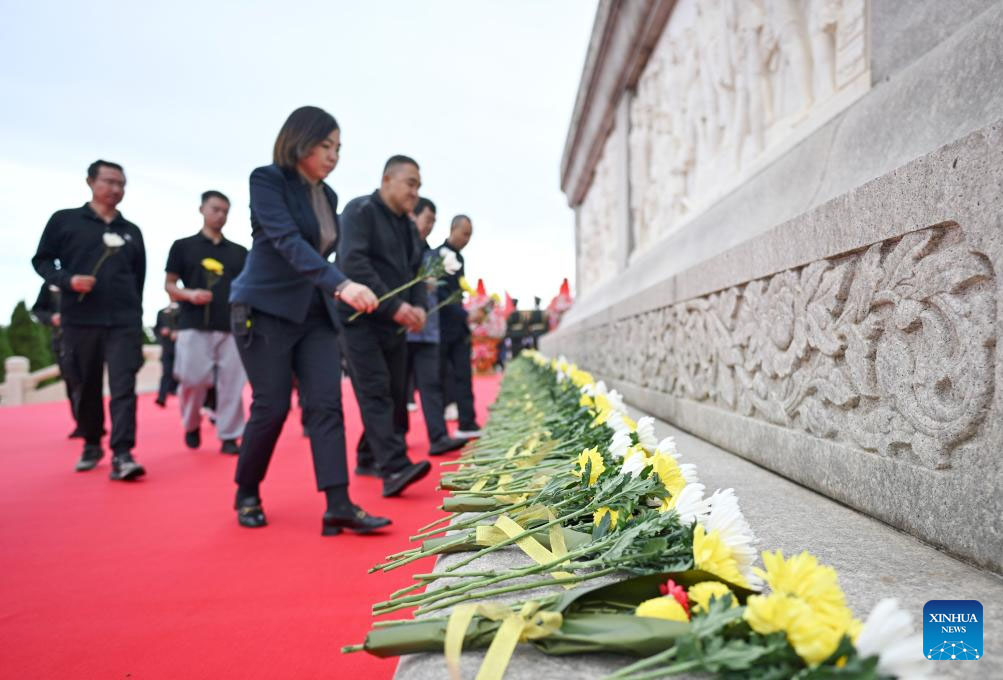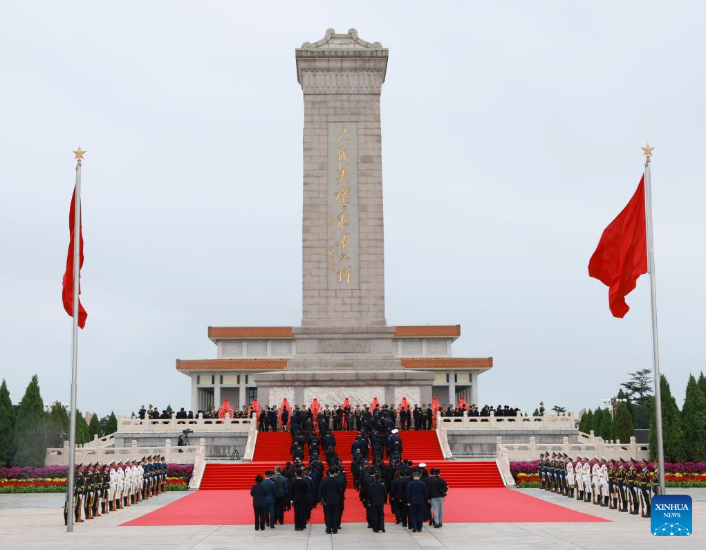 A ceremony presenting flower baskets to fallen heroes to mark Martyrs' Day is held at Tian'anmen Square in Beijing, capital of China, Sept. 30, 2024. (Xinhua/Yan Yan)
