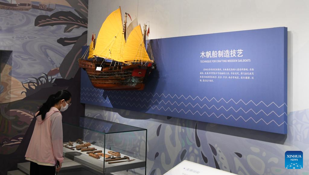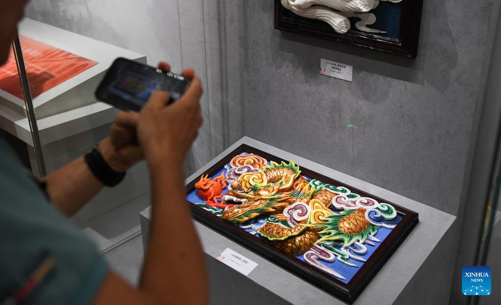 A visitor takes photos of an exhibit at the Hainan Intangible Cultural Heritage Exhibition Center in Haikou, south China's Hainan Province, Sept. 30, 2024. The exhibition center, one of the provincial capital's major public cultural projects, began trial operation on Monday and will last for one month. (Xinhua/Yang Guanyu)