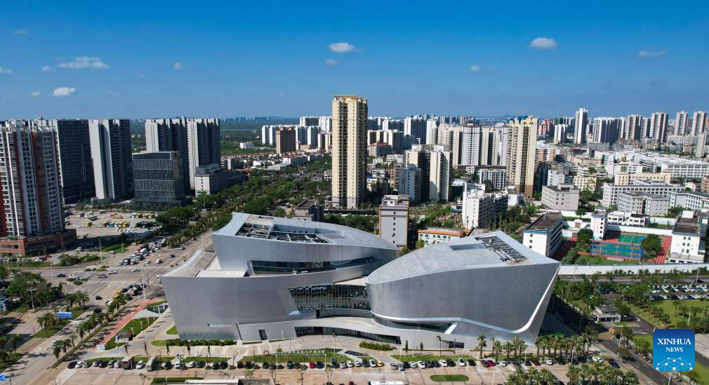 An aerial drone photo taken on Sept. 30, 2024 shows the Hainan Intangible Cultural Heritage Exhibition Center in Haikou, south China's Hainan Province. The exhibition center, one of the provincial capital's major public cultural projects, began trial operation on Monday and will last for one month. (Xinhua/Yang Guanyu)