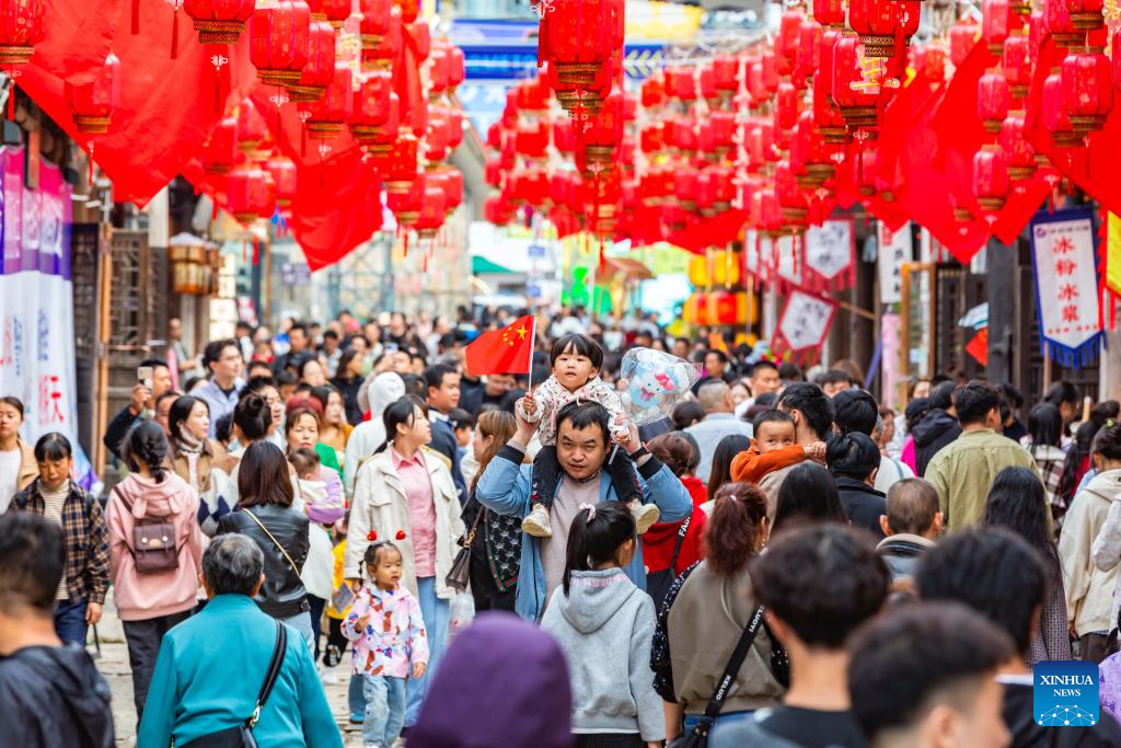 People visit a historical and cultural street in Xixiu District of Anshun City, southwest China's Guizhou Province, Oct. 2, 2024. The National Day holiday period, which runs from Oct. 1 to Oct. 7 this year, is a peak travel and tourism season in China. (Photo by Chen Xi/Xinhua)