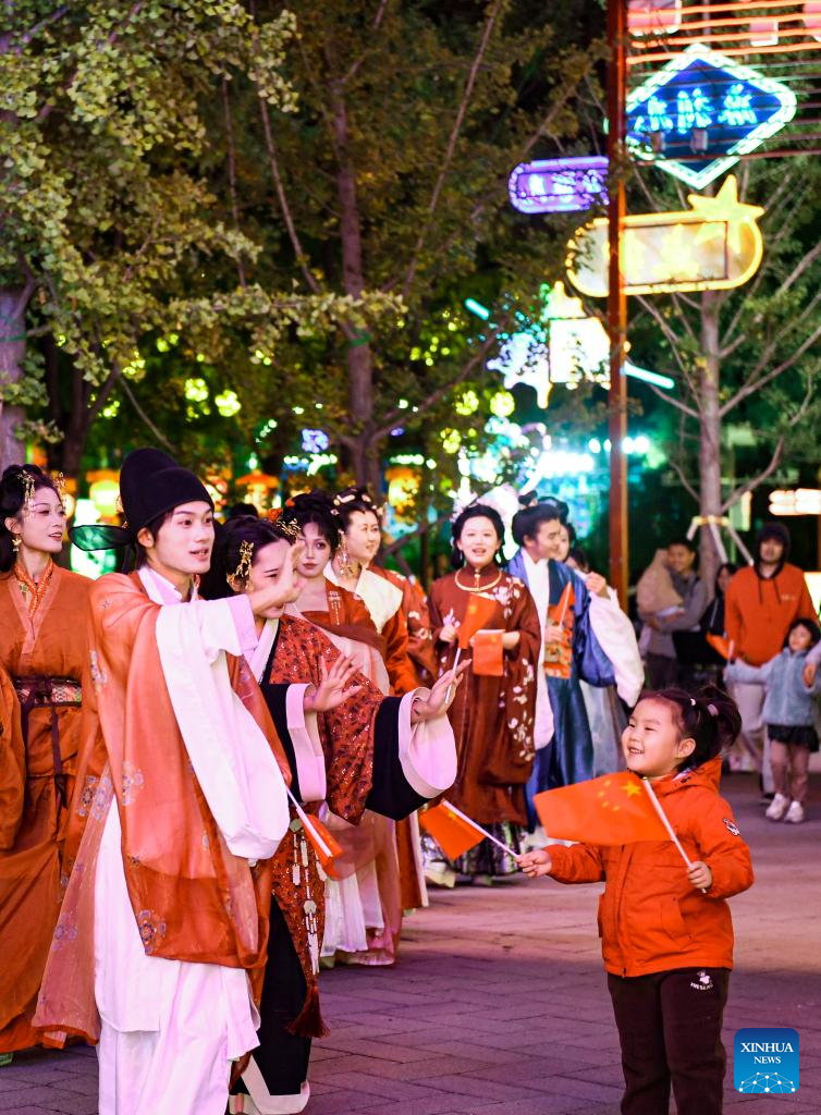 Young people in traditional Chinese attire interact with tourists during a popular festive gathering in Beijing, capital of China, Oct. 1, 2024. The National Day holiday period, which runs from Oct. 1 to Oct. 7 this year, is a peak travel and tourism season in China. (Xinhua/Chen Zhonghao)