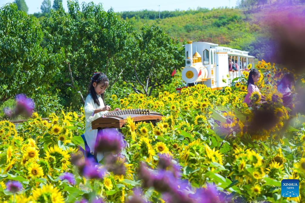 A girl plays traditional Chinese musical instrument guzheng at a sunflower field in Donggaohe Village in Fuxing District of Handan City, north China's Hebei Province, Oct. 1, 2024. The National Day holiday period, which runs from Oct. 1 to Oct. 7 this year, is a peak travel and tourism season in China. (Xinhua/Yue Wenting)