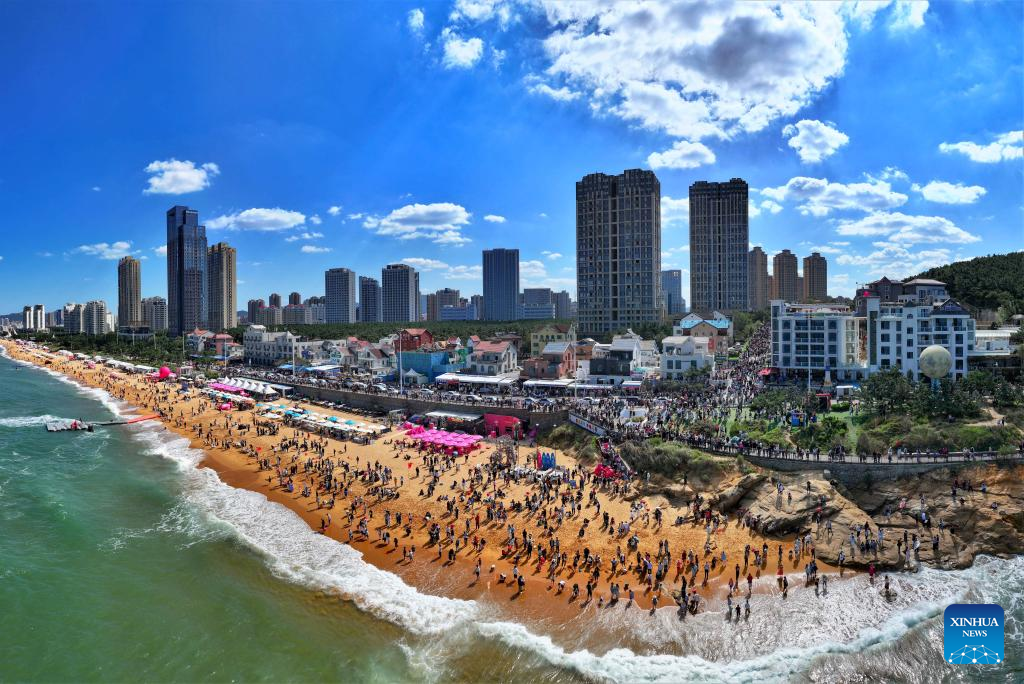 An aerial drone photo shows people enjoying themselves at a beach in Weihai, east China's Shandong Province, Oct. 2, 2024. The National Day holiday period, which runs from Oct. 1 to Oct. 7 this year, is a peak travel and tourism season in China. (Photo by Zhu Chunxiao/Xinhua)
