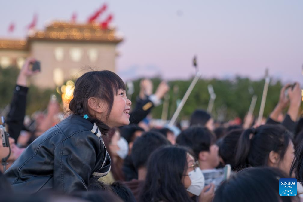 People wait to watch the flag-raising ceremony at Tian'anmen Square in Beijing, capital of China, Oct. 1, 2024. The National Day holiday period, which runs from Oct. 1 to Oct. 7 this year, is a peak travel and tourism season in China. (Xinhua/Peng Yikai)