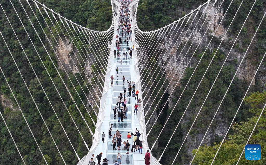 An aerial drone photo shows tourists having fun on a glass-bottomed bridge at Zhangjiajie Grand Canyon in central China's Hunan Province, Oct. 2, 2024. The National Day holiday period, which runs from Oct. 1 to Oct. 7 this year, is a peak travel and tourism season in China. (Photo by Wu Yongbing/Xinhua)