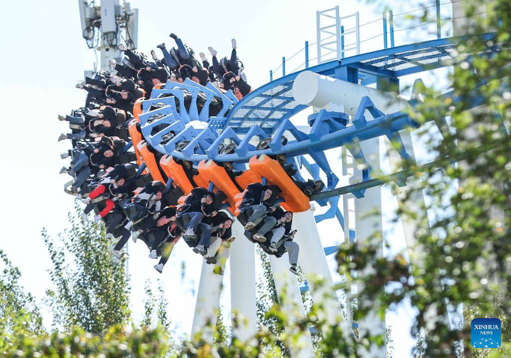 Tourists have fun at the Fantawild Adventure in Shenyang, northeast China's Liaoning Province, Oct. 2, 2024. The National Day holiday period, which runs from Oct. 1 to Oct. 7 this year, is a peak travel and tourism season in China. (Xinhua/Long Lei)