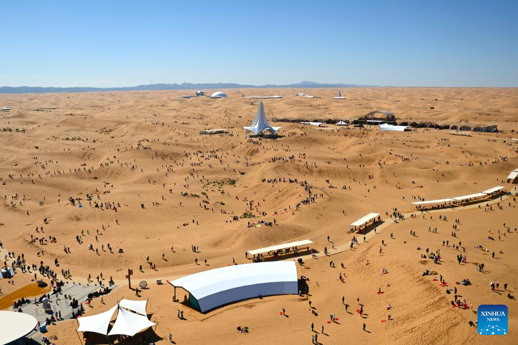 Tourists visit the Shapotou scenic spot in Zhongwei, northwest China's Ningxia Hui Autonomous Region, Oct. 2, 2024. The National Day holiday period, which runs from Oct. 1 to Oct. 7 this year, is a peak travel and tourism season in China. (Xinhua/Mao Zhu)