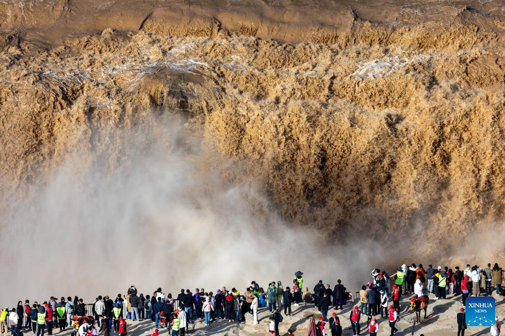 Tourists enjoy the scenery of the Hukou Waterfall on the Yellow River, in Jixian County, north China's Shanxi Province on Oct. 1, 2024. The National Day holiday period, which runs from Oct. 1 to Oct. 7 this year, is a peak travel and tourism season in China. (Photo by Liu Hongda/Xinhua)
