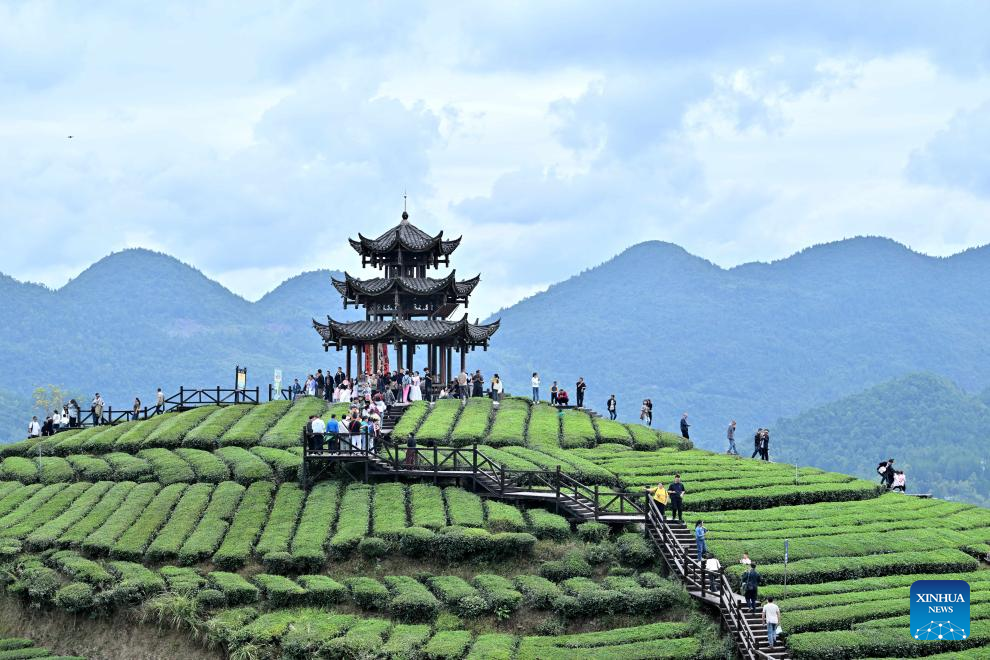 Tourists go sightseeing at a tea-themed scenic area in Xuanen County of Enshi Tujia and Miao Autonomous Prefecture, central China's Hubei Province, Oct. 2, 2024. The National Day holiday period, which runs from Oct. 1 to Oct. 7 this year, is a peak travel and tourism season in China. (Photo by Chen Xukai/Xinhua)