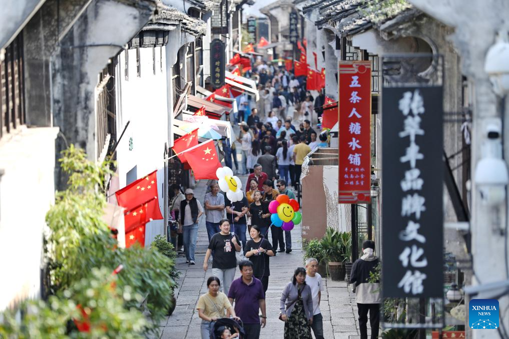 People visit Yuehe historical area in Nanhu District, Jiaxing of east China's Zhejiang Province, Oct. 2, 2024. The National Day holiday period, which runs from Oct. 1 to Oct. 7 this year, is a peak travel and tourism season in China. (Photo by Jin Peng/Xinhua)