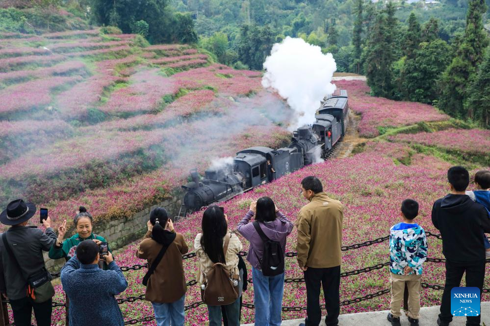 Tourists take pictures of a steam train running at a scenic spot in Jianwei County of Leshan City, southwest China's Sichuan Province, Oct. 2, 2024. The National Day holiday period, which runs from Oct. 1 to Oct. 7 this year, is a peak travel and tourism season in China. (Photo by Zhang Xiang/Xinhua)