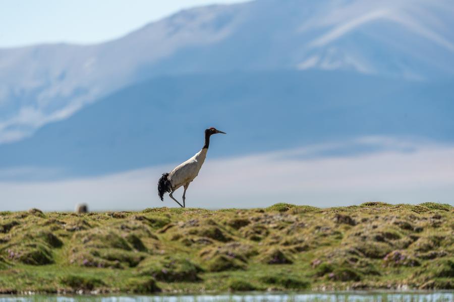 A black-necked crane, a species under first-class state protection in China, is seen at a wetland in Xainza County of Nagqu City, southwest China's Xizang Autonomous Region, June 8, 2024. (Xinhua/Tenzing Nima Qadhup)