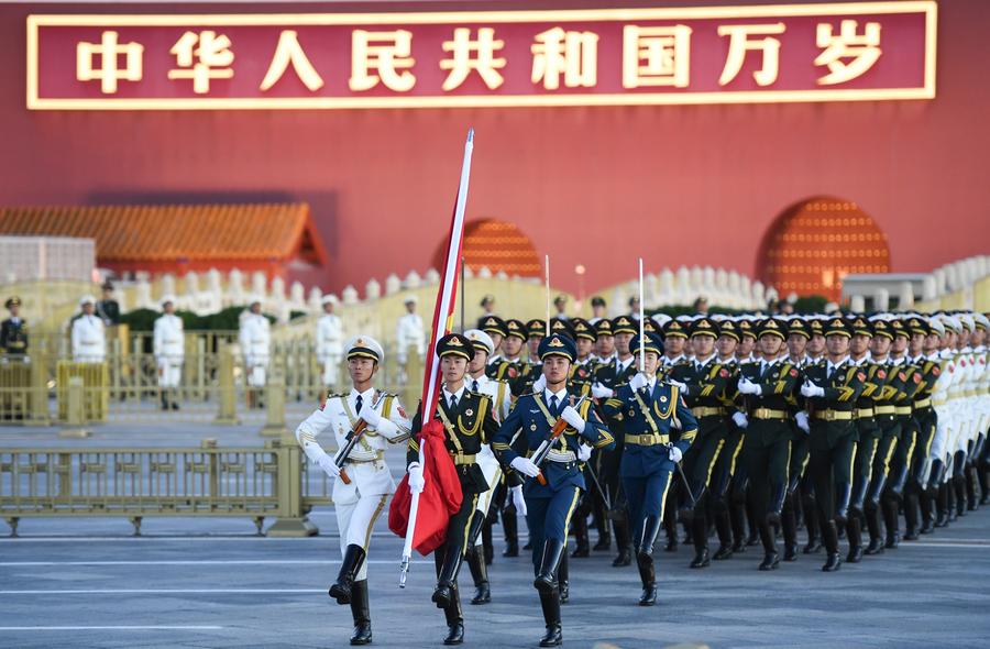 BEIJING, Oct. 1 (Xinhua) -- Ready to welcome myriad domestic and foreign tourists over the coming days, Tian'anmen Square, the political heart of China and no stranger to pomp and ceremony, has been given a festive makeover featuring an 18-meter-high flower basket centerpiece.