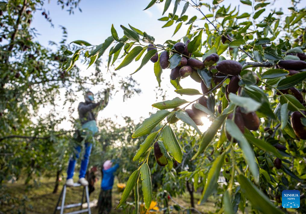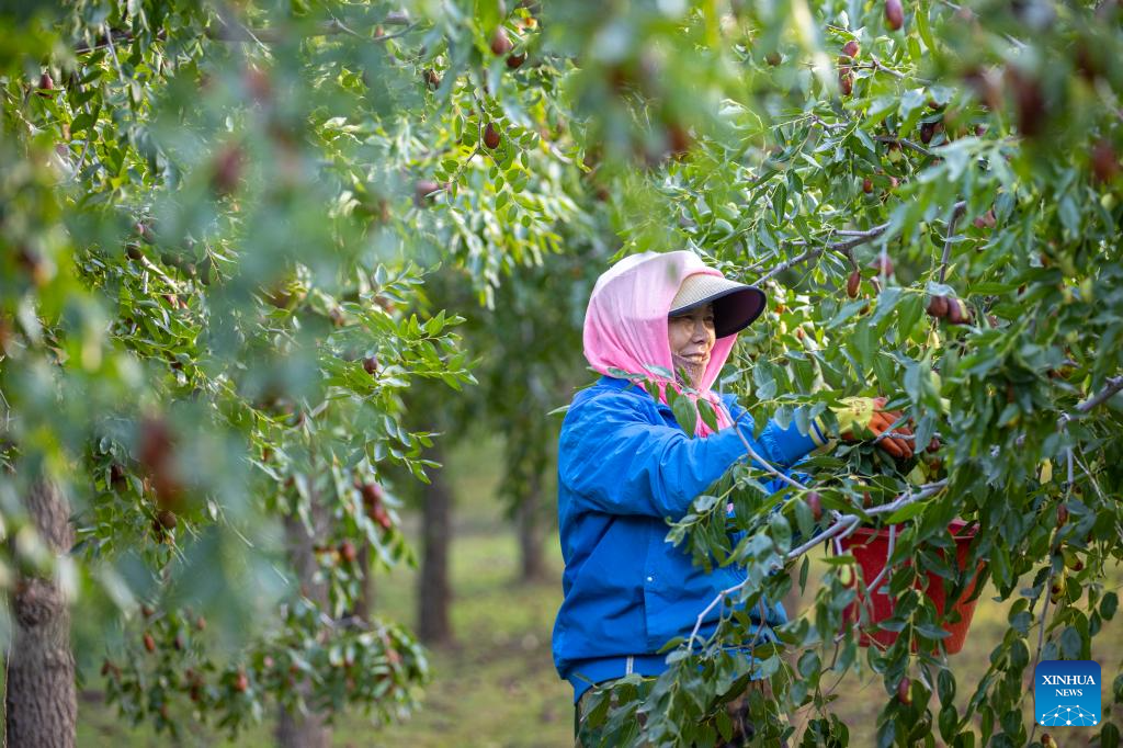 A farmer harvests local specialty jujubes at a planting base in Dongta Town of Lingwu City, northwest China's Ningxia Hui Autonomous Region, Sept. 30, 2024. Recently, Lingwu is witnessing the harvest season for its 68,300 mu (about 4,553.33 hectares) of specialty jujubes. (Xinhua/Yang Zhisen)