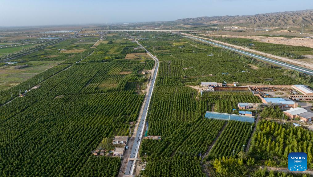 An aerial drone photo taken on Sept. 30, 2024 shows a planting base of local specialty jujubes in Dongta Town of Lingwu City, northwest China's Ningxia Hui Autonomous Region. Recently, Lingwu is witnessing the harvest season for its 68,300 mu (about 4,553.33 hectares) of specialty jujubes. (Xinhua/Yang Zhisen)