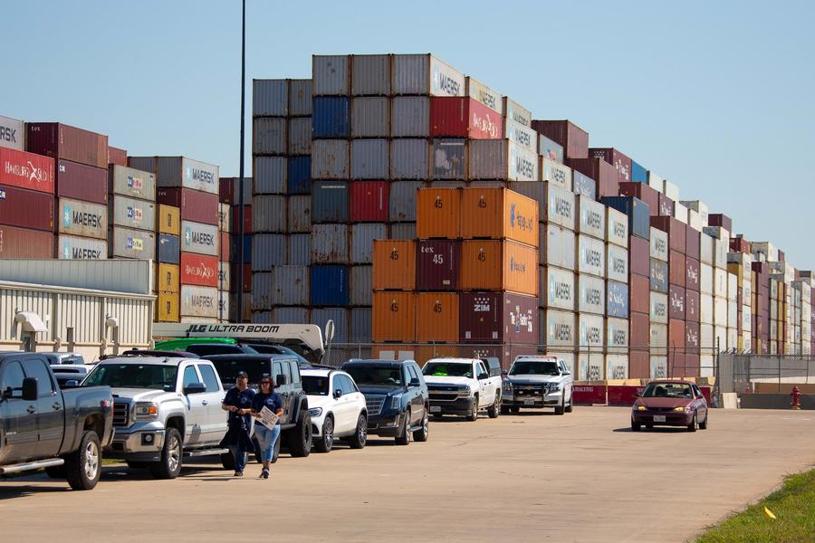 Port workers participate in a strike at the Port Houston in Texas, the United States, on Oct. 1, 2024. (Photo by Chengyue Lao/Xinhua)