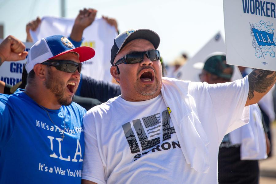 Port workers participate in a strike at the Port of Houston in Texas, the United States, on Oct. 1, 2024. (Photo by Chengyue Lao/Xinhua)