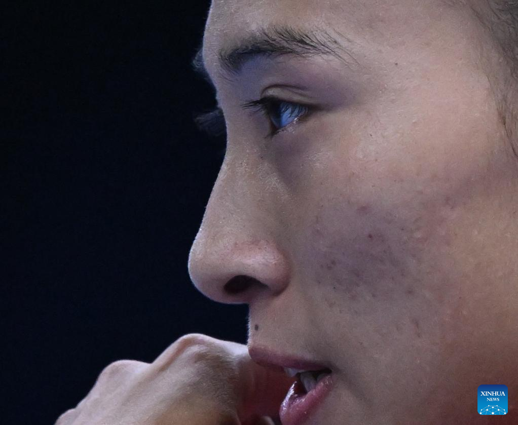 Zheng Qinwen reacts during the women's singles quarterfinal match between Zheng Qinwen of China and Mirra Andreeva of Russia at the 2024 China Open tennis tournament in Beijing, China, Oct. 4, 2024. (Xinhua/Zhang Long)