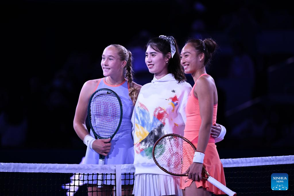 Zheng Qinwen (R), Mirra Andreeva (L) and Chinese swimmer Zhang Yufei pose for photos before the women's singles quarterfinal match between Zheng Qinwen of China and Mirra Andreeva of Russia at the 2024 China Open tennis tournament in Beijing, China, Oct. 4, 2024. (Xinhua/Zhang Long)