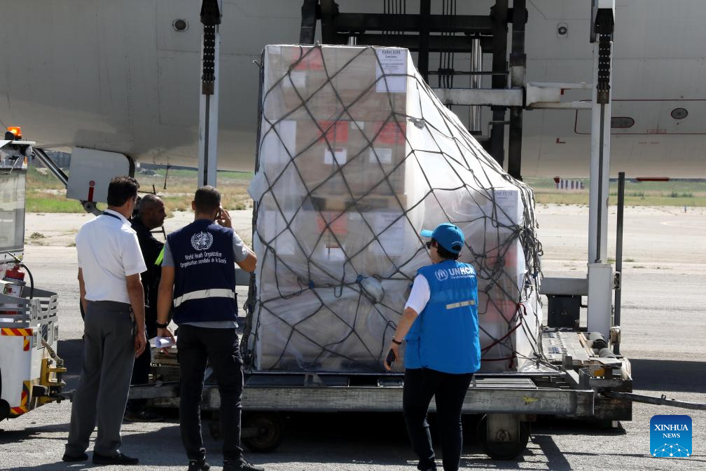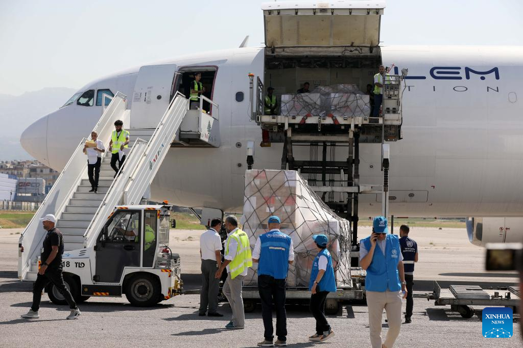 Aid provided by the World Health Organization (WHO) and the United Nations High Commissioner for Refugees (UNHCR) is unloaded at an airport in Beirut, Lebanon, on Oct. 4, 2024. An aid plane carrying 55 tons of aid and medical supplies arrived Friday in Lebanon from the United Arab Emirates, the National News Agency (NNA) reported. This aid was provided by the World Health Organization (WHO) and the United Nations High Commissioner for Refugees (UNHCR), said the report. (Xinhua/Bilal Jawich)