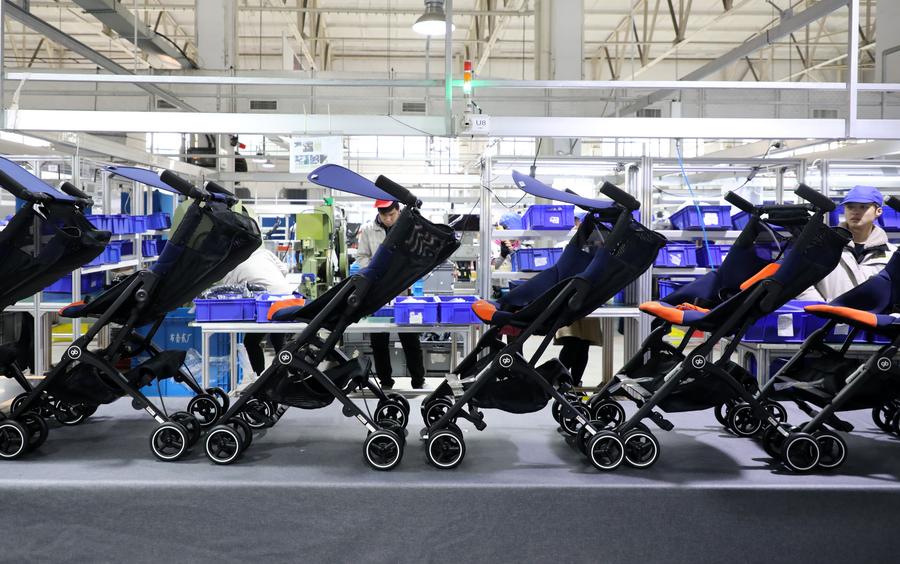 Staff members work on the assembly line of Goodbaby Group Co., a parenting products company based in Kunshan, east China's Jiangsu Province, Jan. 24, 2019. (Xinhua/Xue Hongyu)