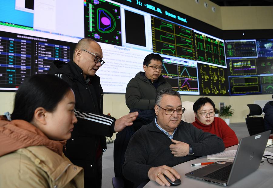 Chinese scientists discuss experiment plans with an ITER researcher (2nd R) in Hefei, east China's Anhui Province, Jan. 24, 2024. (Xinhua/Zhang Duan)