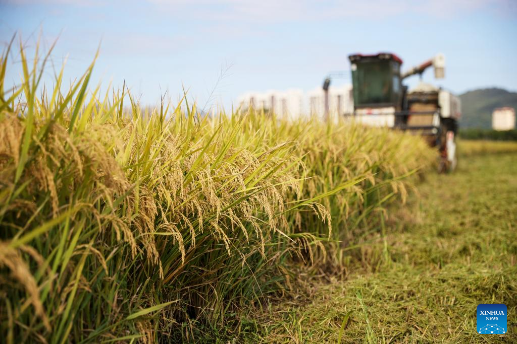 A harvester works in rice paddies in Shangqiang Village of Wuxing District in Huzhou City, east China's Zhejiang Province, Oct. 4, 2024. (Photo by He Weiwei/Xinhua)
