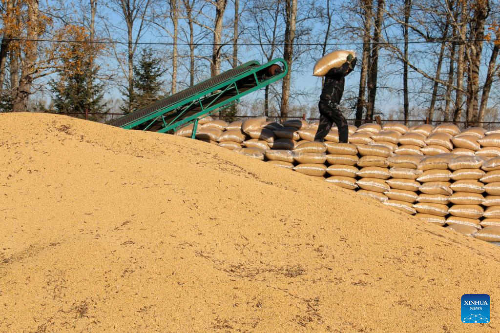 A farmer piles packed soybeans up at a farm of Beidahuang Group in northeast China's Heilongjiang Province, Oct. 3, 2024. (Photo by Lu Wenxiang/Xinhua)