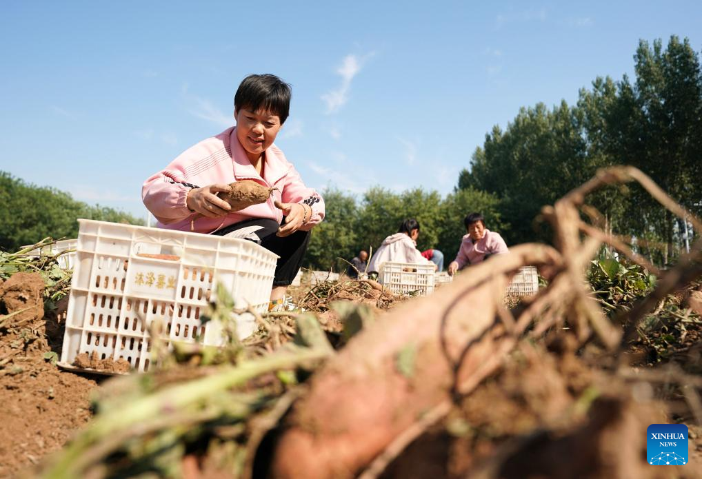 Farmers harvest sweet potatoes in Houduanzhai Village of Qiuxian County, north China's Hebei Province, Oct. 4, 2024. (Xinhua/Wang Xiao)
