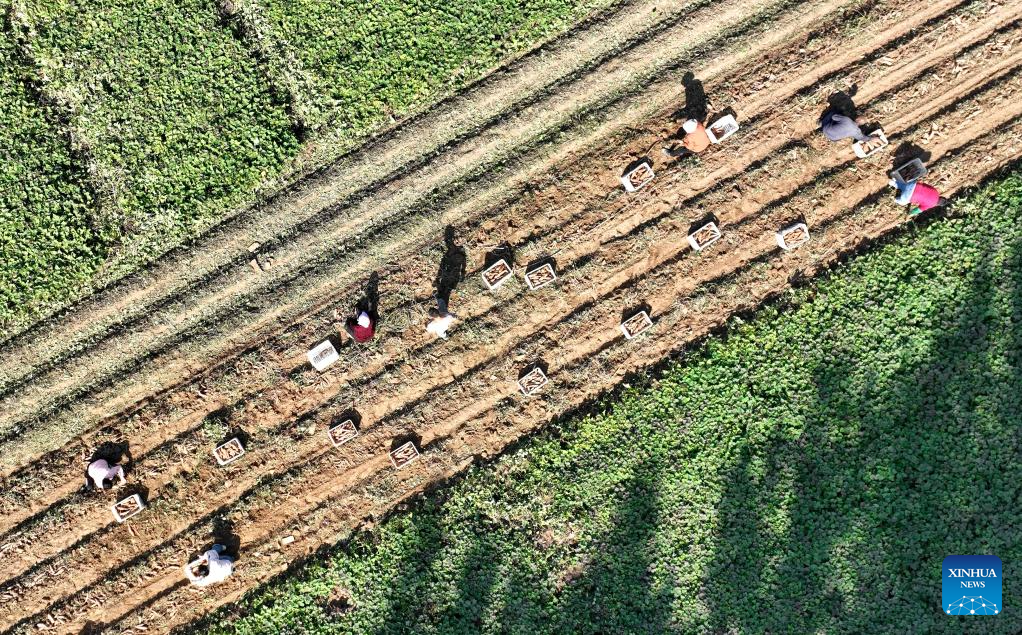 An aerial drone photo shows farmers harvesting sweet potatoes in Houduanzhai Village of Qiuxian County, north China's Hebei Province, Oct. 4, 2024. (Xinhua/Wang Xiao)