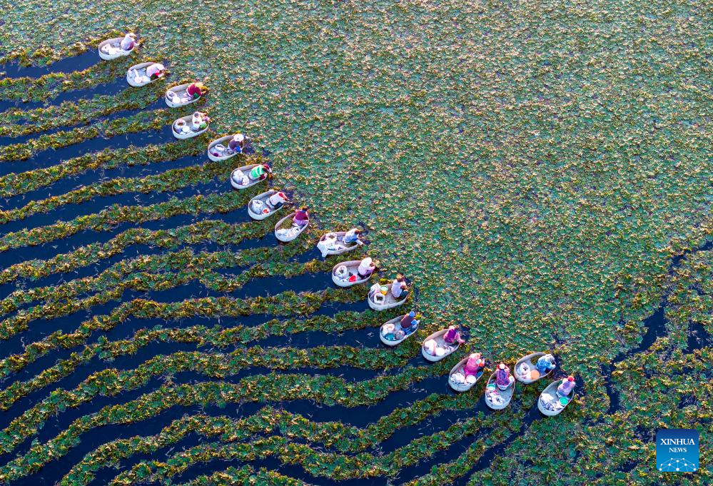 An aerial drone photo shows farmers picking water caltrops in Suchen Town of Hailing District in Taizhou City, east China's Jiangsu province, Oct. 4, 2024. (Photo by Tang Dehong/Xinhua)
