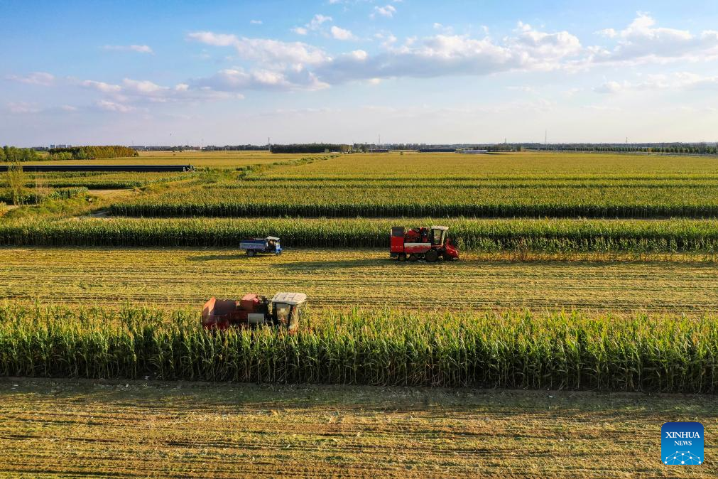 An aerial drone photo shows harvesters working in corn fields in Yanjia Village of Guangrao County, east China's Shandong Province, Oct. 1, 2024. (Photo by Liu Yunjie/Xinhua)