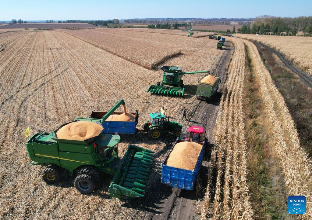 An aerial drone photo shows agricultural machines harvesting corn at a farm of Beidahuang Group in northeast China's Heilongjiang Province, Oct. 1, 2024. (Photo by Xu Yingxian/Xinhua)