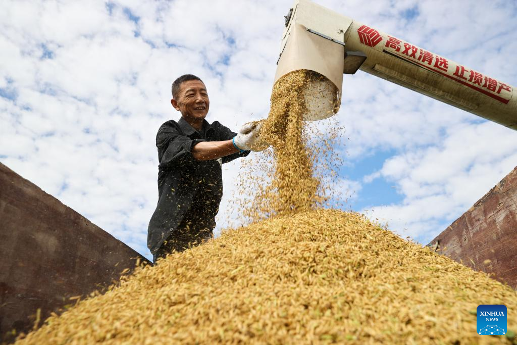 A farmer checks newly-harvested rice in Shangqiang Village of Wuxing District in Huzhou City, east China's Zhejiang Province, Oct. 4, 2024. (Photo by He Weiwei/Xinhua)