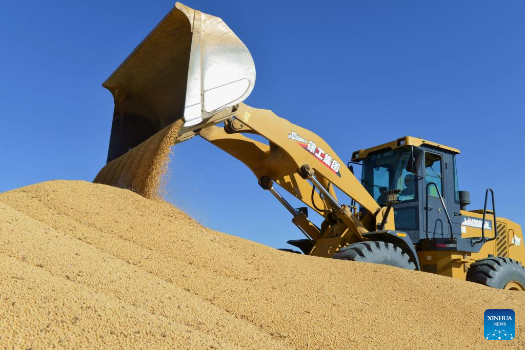 A shovel loader transfers soybeans at a farm of Beidahuang Group in northeast China's Heilongjiang Province, Oct. 3, 2024. (Photo by Qian Boyu/Xinhua)