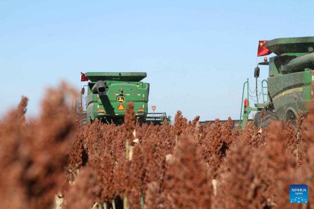 Harvesters work in sorghum fields at a farm of Beidahuang Group in northeast China's Heilongjiang Province, Oct. 3, 2024. (Photo by Lin Jinchun/Xinhua)